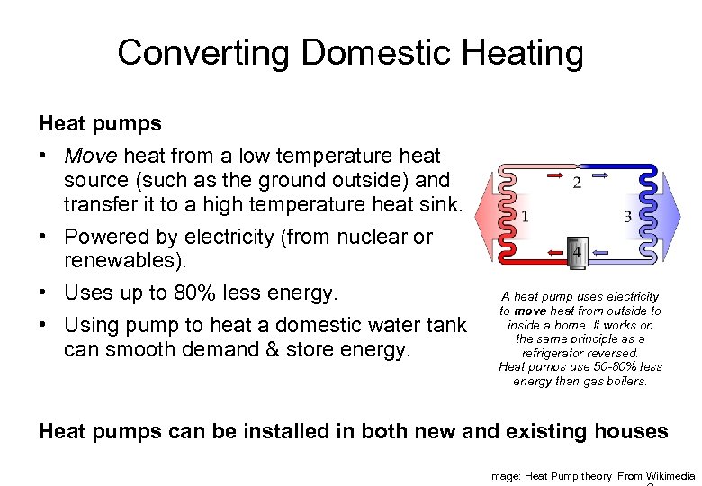 Converting Domestic Heating Heat pumps • Move heat from a low temperature heat source (such as the ground outside) and transfer it to a high temperature heat sink. • Powered by electricity (from nuclear or renewables). • Uses up to 80% less energy. • Using pump to heat a domestic water tank can smooth demand & store energy. A heat pump uses electricity to move heat from outside to inside a home. It works on the same principle as a refrigerator reversed. Heat pumps use 50 -80% less energy than gas boilers. Heat pumps can be installed in both new and existing houses Image: Heat Pump theory From Wikimedia