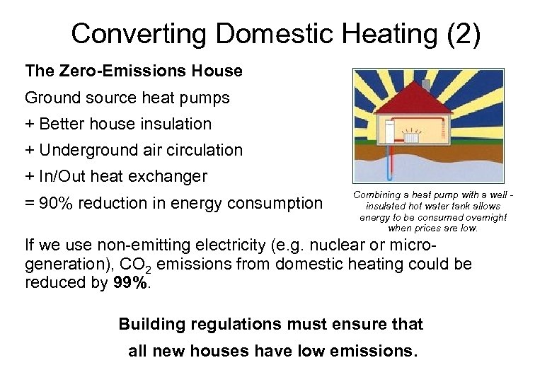 Converting Domestic Heating (2) The Zero-Emissions House Ground source heat pumps + Better house insulation + Underground air circulation + In/Out heat exchanger = 90% reduction in energy consumption Combining a heat pump with a well insulated hot water tank allows energy to be consumed overnight when prices are low. If we use non-emitting electricity (e. g. nuclear or microgeneration), CO 2 emissions from domestic heating could be reduced by 99%. Building regulations must ensure that all new houses have low emissions.