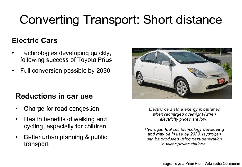 Converting Transport: Short distance Electric Cars • Technologies developing quickly, following success of Toyota Prius • Full conversion possible by 2030 Reductions in car use • Charge for road congestion • Health benefits of walking and cycling, especially for children • Better urban planning & public transport Electric cars store energy in batteries when recharged overnight (when electricity prices are low). Hydrogen fuel cell technology developing and may be in use by 2030. Hydrogen can be produced using next-generation nuclear power stations. Image: Toyota Prius From Wikimedia Commons