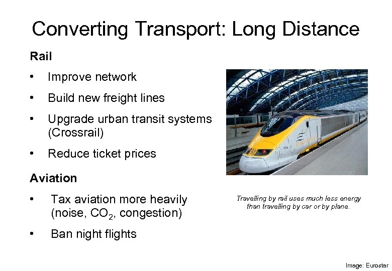 Converting Transport: Long Distance Rail • Improve network • Build new freight lines • Upgrade urban transit systems (Crossrail) • Reduce ticket prices Aviation • Tax aviation more heavily (noise, CO 2, congestion) • Ban night flights Travelling by rail uses much less energy than travelling by car or by plane. Image: Eurostar