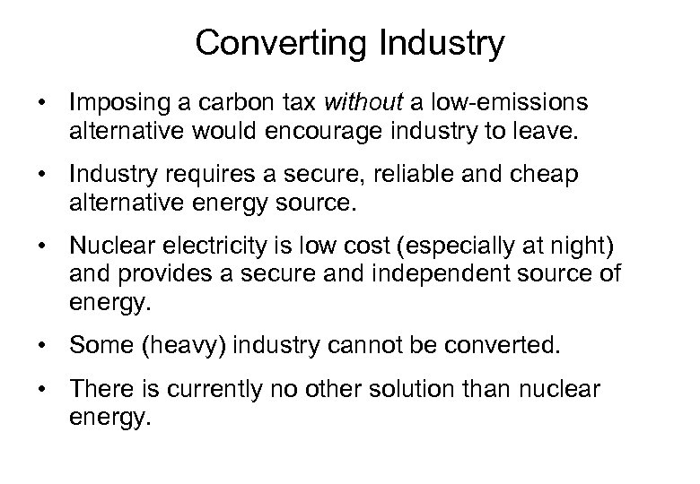 Converting Industry • Imposing a carbon tax without a low-emissions alternative would encourage industry to leave. • Industry requires a secure, reliable and cheap alternative energy source. • Nuclear electricity is low cost (especially at night) and provides a secure and independent source of energy. • Some (heavy) industry cannot be converted. • There is currently no other solution than nuclear energy.