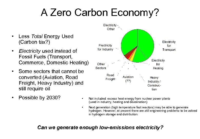A Zero Carbon Economy? • Less Total Energy Used (Carbon tax? ) • Electricity used instead of Fossil Fuels (Transport, Commerce, Domestic Heating) • Some sectors that cannot be converted (Aviation, Road Freight, Heavy Industry) and still require oil • Possible by 2030? • Not included: excess heat energy from nuclear power plants (used in industry, heating and desalination). • Next generation (high temperature fast reactors) may be able to generate hydrogen. However, at present there are still engineering problems to be solved in hydrogen storage and distribution. Can we generate enough low-emissions electricity?