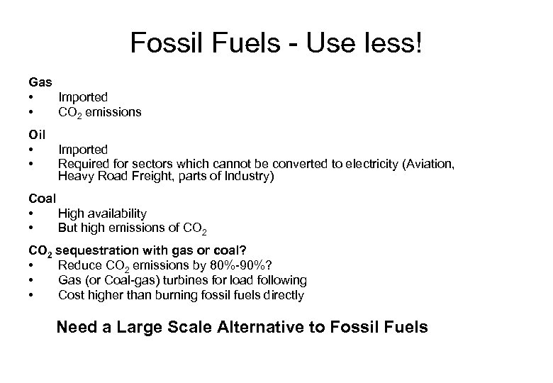 Fossil Fuels - Use less! Gas • Imported • CO 2 emissions Oil • Imported • Required for sectors which cannot be converted to electricity (Aviation, Heavy Road Freight, parts of Industry) Coal • High availability • But high emissions of CO 2 sequestration with gas or coal? • Reduce CO 2 emissions by 80%-90%? • Gas (or Coal-gas) turbines for load following • Cost higher than burning fossil fuels directly Need a Large Scale Alternative to Fossil Fuels