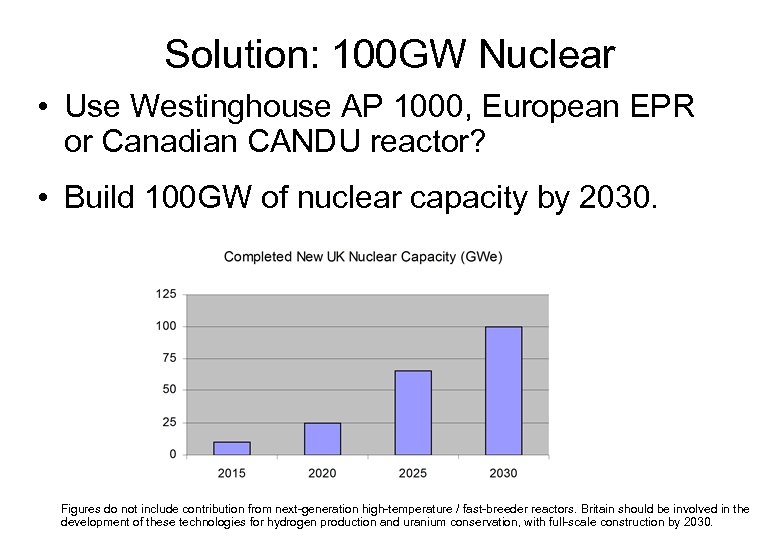 Solution: 100 GW Nuclear • Use Westinghouse AP 1000, European EPR or Canadian CANDU reactor? • Build 100 GW of nuclear capacity by 2030. Figures do not include contribution from next-generation high-temperature / fast-breeder reactors. Britain should be involved in the development of these technologies for hydrogen production and uranium conservation, with full-scale construction by 2030.