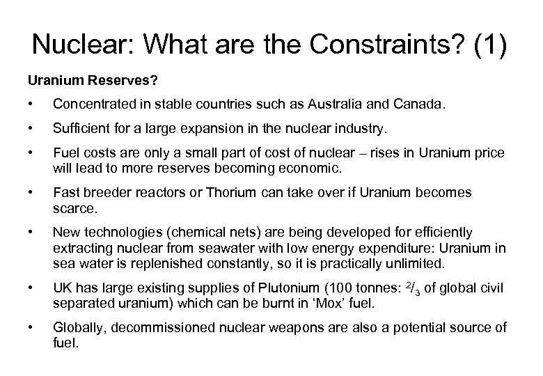 Nuclear: What are the Constraints? (1) Uranium Reserves? • Concentrated in stable countries such as Australia and Canada. • Sufficient for a large expansion in the nuclear industry. • Fuel costs are only a small part of cost of nuclear – rises in Uranium price will lead to more reserves becoming economic. • Fast breeder reactors or Thorium can take over if Uranium becomes scarce. • New technologies (chemical nets) are being developed for efficiently extracting nuclear from seawater with low energy expenditure: Uranium in sea water is replenished constantly, so it is practically unlimited. • UK has large existing supplies of Plutonium (100 tonnes: 2/3 of global civil separated uranium) which can be burnt in ‘Mox’ fuel. • Globally, decommissioned nuclear weapons are also a potential source of fuel.