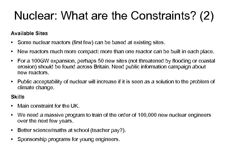 Nuclear: What are the Constraints? (2) Available Sites • Some nuclear reactors (first few) can be based at existing sites. • New reactors much more compact: more than one reactor can be built in each place. • For a 100 GW expansion, perhaps 50 new sites (not threatened by flooding or coastal erosion) should be found across Britain. Need public information campaign about new reactors. • Public acceptability of nuclear will increase if it is seen as a solution to the problem of climate change. Skills • Main constraint for the UK. • We need a massive program to train of the order of 100, 000 new nuclear engineers over the next few years. • Better science/maths at school (teacher pay? ). • Sponsorship programs for young engineers.
