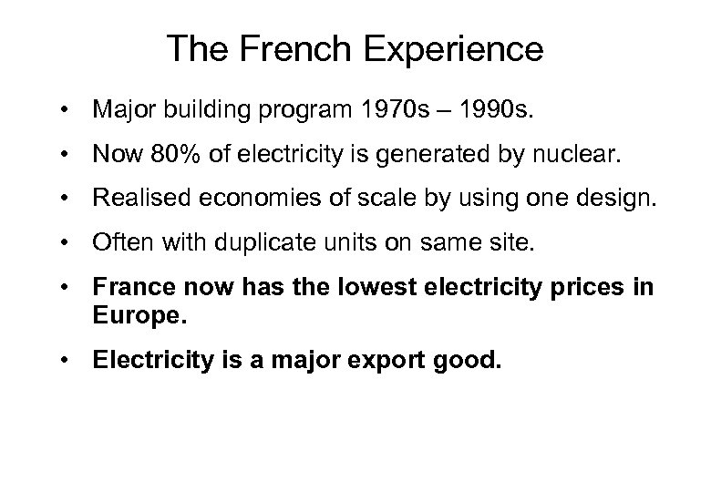 The French Experience • Major building program 1970 s – 1990 s. • Now 80% of electricity is generated by nuclear. • Realised economies of scale by using one design. • Often with duplicate units on same site. • France now has the lowest electricity prices in Europe. • Electricity is a major export good.