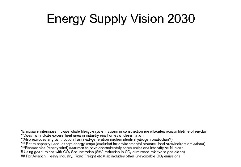 Energy Supply Vision 2030 *Emissions intensities include whole lifecycle (so emissions in construction are allocated across lifetime of reactor. **Does not include excess heat used in industry and homes or desalination **Also excludes any contribution from next-generation nuclear plants (hydrogen production? ) *** Entire capacity used, except energy crops (excluded for environmental reasons: land area/indirect emissions) ***Renewables (mostly wind) assumed to have approximately same emissions intensity as Nuclear. # Using gas turbines with CO 2 Sequestration (85% reduction in CO 2 eliminated relative to gas alone). ## For Aviation, Heavy Industry, Road Freight etc Also includes other unavoidable CO 2 emissions