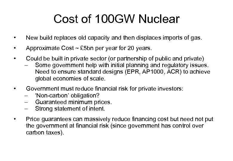 Cost of 100 GW Nuclear • New build replaces old capacity and then displaces imports of gas. • Approximate Cost ~ £ 5 bn per year for 20 years. • Could be built in private sector (or partnership of public and private) – Some government help with initial planning and regulatory issues. Need to ensure standard designs (EPR, AP 1000, ACR) to achieve global economies of scale. • Government must reduce financial risk for private investors: – ‘Non-carbon’ obligation? – Guaranteed minimum prices. – Strong statement of intent. • Price guarantees can massively reduce financing cost but need not put the government at financial risk (since government has control over carbon taxes).