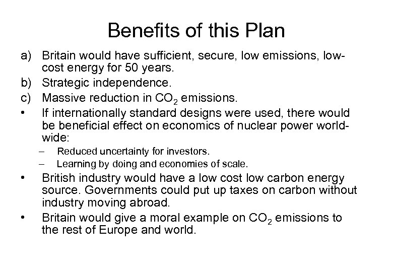 Benefits of this Plan a) Britain would have sufficient, secure, low emissions, lowcost energy for 50 years. b) Strategic independence. c) Massive reduction in CO 2 emissions. • If internationally standard designs were used, there would be beneficial effect on economics of nuclear power worldwide: – – • • Reduced uncertainty for investors. Learning by doing and economies of scale. British industry would have a low cost low carbon energy source. Governments could put up taxes on carbon without industry moving abroad. Britain would give a moral example on CO 2 emissions to the rest of Europe and world.