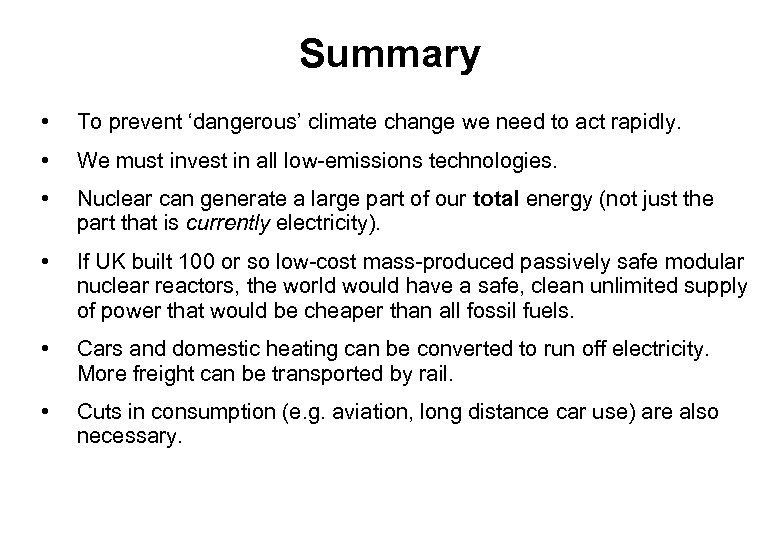Summary • To prevent ‘dangerous’ climate change we need to act rapidly. • We must invest in all low-emissions technologies. • Nuclear can generate a large part of our total energy (not just the part that is currently electricity). • If UK built 100 or so low-cost mass-produced passively safe modular nuclear reactors, the world would have a safe, clean unlimited supply of power that would be cheaper than all fossil fuels. • Cars and domestic heating can be converted to run off electricity. More freight can be transported by rail. • Cuts in consumption (e. g. aviation, long distance car use) are also necessary.