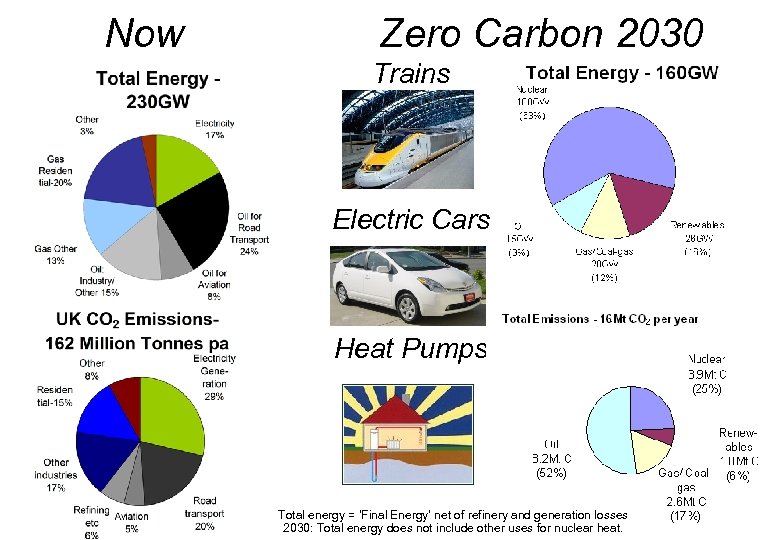 Now Zero Carbon 2030 Trains Electric Cars Heat Pumps Total energy = ‘Final Energy’ net of refinery and generation losses 2030: Total energy does not include other uses for nuclear heat.