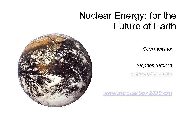 Nuclear Energy: for the Future of Earth Comments to: Stephen Stretton stephen@ecolo. org www. zerocarbon 2030. org