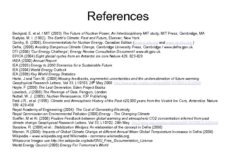 References Beckjord, E. et al. / MIT (2003) The Future of Nuclear Power, An Interdisciplinary MIT study, MIT Press, Cambridge, MA Budyko, M. I. (1982), The Earth’s Climate: Past and Future, Elsevier, New York Comby, B. (2006), Environmentalists for Nuclear Energy, Canadian Edition (www. ecolo. org and www. comby. org ) Defra, (2006) Avoiding Dangerous Climate Change, Cambridge University Press, Cambridge / www. defra. gov. uk DTI (2006) 'Our Energy Challenge', Energy Review Consultation Document / www. dti. gov. uk EPICA (2004) Eight glacial cycles from an Antarctic ice core Nature 429, 623 -628 IAEA (2000) Annual Report IEA (2003) Energy to 2050 Scenarios for a Sustainable Future IEA (2004) World Energy Outlook IEA (2005) Key World Energy Statistics Harte, J and Torn M. (2006) Missing feedbacks, asymmetric uncertainties and the underestimation of future warming Geophysical Research Letters, Vol 33, L 10703, 26 th May 2006 http: //www. agu. org/journals/gl/gl 0610/2005 GL 025540/ Hoyle, F (2006) The Last Generation, Eden Project Books Lovelock, J (2006) The Revenge of Gaia, Penguin, London Nuttall, W. J. (2005), Nuclear Renaissance, IOP Publishing Petit J. R. , et al. (1999). Climate and Atmospheric History of the Past 420, 000 years from the Vostok Ice Core, Antarctica. Nature 399: 429 -436 Royal Academy of Engineering (2004): The Cost of Generating Electricity Royal Commission on Environmental Pollution (2000) Energy - The Changing Climate Sceffer, M et Al. (2006) Positive Feedback between global warming and atmospheric CO 2 concentration inferred from past climate change Geophysical Research Letters, Vol 33, L 10702, 26 th May http: //www. agu. org/journals/gl/gl 0610/2005 GL 025044/ Socolow, R. (2006) et al. : Stabilization Wedges: An elaboration of the concept in Defra (2006) Warren, R (2006): Impacts of Global Climate Change at different Annual Mean Global Temperature Increases in Defra (2006) Wikipedia – www. wikipedia. org and Wikimedia - commons. wikimedia. org Wikisource Images use http: //en. wikipedia. org/wiki/GNU_Free_Documentation_License World Energy Council (2000) Energy For Tomorrow's World