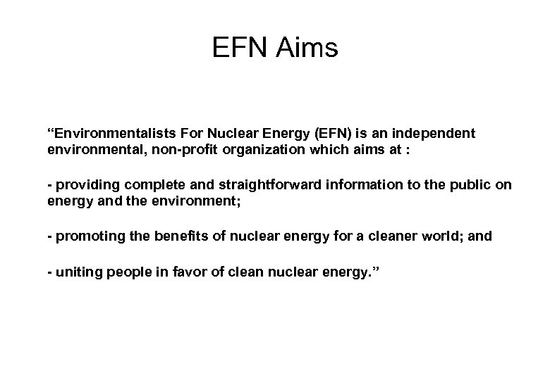 EFN Aims “Environmentalists For Nuclear Energy (EFN) is an independent environmental, non-profit organization which aims at : - providing complete and straightforward information to the public on energy and the environment; - promoting the benefits of nuclear energy for a cleaner world; and - uniting people in favor of clean nuclear energy. ”