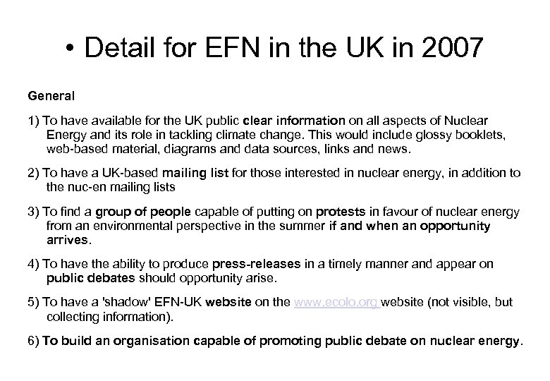 • Detail for EFN in the UK in 2007 General 1) To have available for the UK public clear information on all aspects of Nuclear Energy and its role in tackling climate change. This would include glossy booklets, web-based material, diagrams and data sources, links and news. 2) To have a UK-based mailing list for those interested in nuclear energy, in addition to the nuc-en mailing lists 3) To find a group of people capable of putting on protests in favour of nuclear energy from an environmental perspective in the summer if and when an opportunity arrives. 4) To have the ability to produce press-releases in a timely manner and appear on public debates should opportunity arise. 5) To have a 'shadow' EFN-UK website on the www. ecolo. org website (not visible, but collecting information). 6) To build an organisation capable of promoting public debate on nuclear energy.
