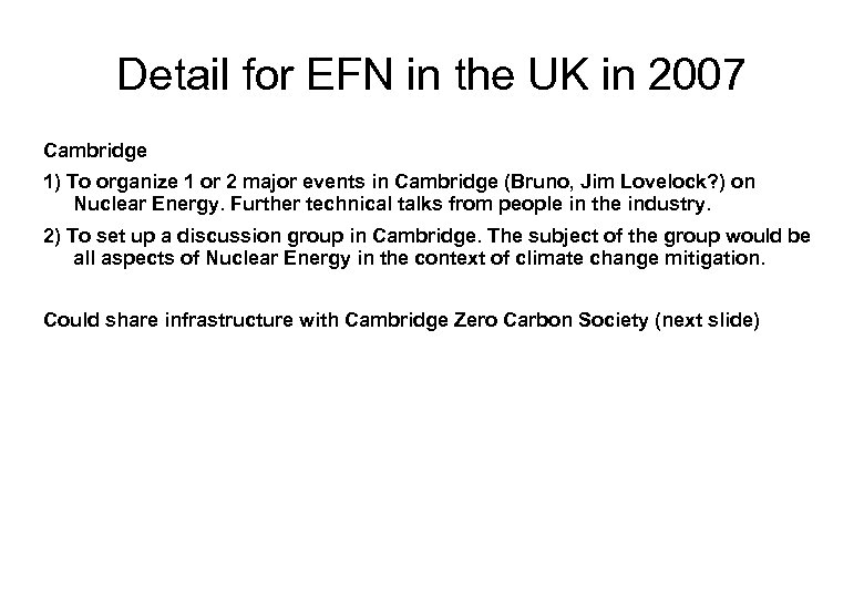 Detail for EFN in the UK in 2007 Cambridge 1) To organize 1 or 2 major events in Cambridge (Bruno, Jim Lovelock? ) on Nuclear Energy. Further technical talks from people in the industry. 2) To set up a discussion group in Cambridge. The subject of the group would be all aspects of Nuclear Energy in the context of climate change mitigation. Could share infrastructure with Cambridge Zero Carbon Society (next slide)