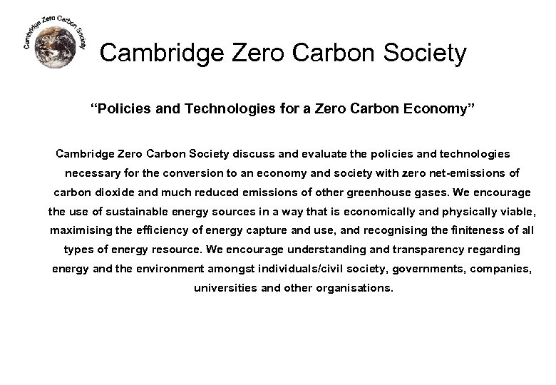 Cambridge Zero Carbon Society “Policies and Technologies for a Zero Carbon Economy” Cambridge Zero Carbon Society discuss and evaluate the policies and technologies necessary for the conversion to an economy and society with zero net-emissions of carbon dioxide and much reduced emissions of other greenhouse gases. We encourage the use of sustainable energy sources in a way that is economically and physically viable, maximising the efficiency of energy capture and use, and recognising the finiteness of all types of energy resource. We encourage understanding and transparency regarding energy and the environment amongst individuals/civil society, governments, companies, universities and other organisations.