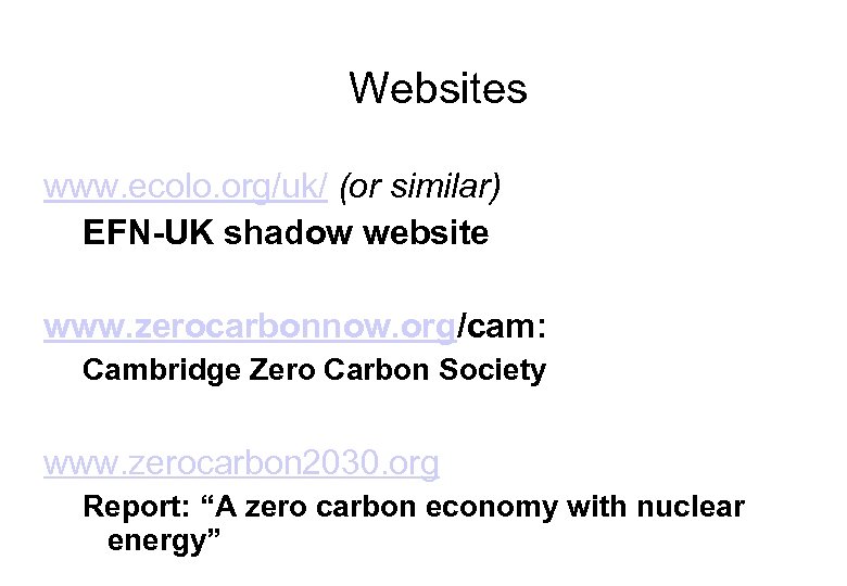 Websites www. ecolo. org/uk/ (or similar) EFN-UK shadow website www. zerocarbonnow. org/cam: Cambridge Zero Carbon Society www. zerocarbon 2030. org Report: “A zero carbon economy with nuclear energy”