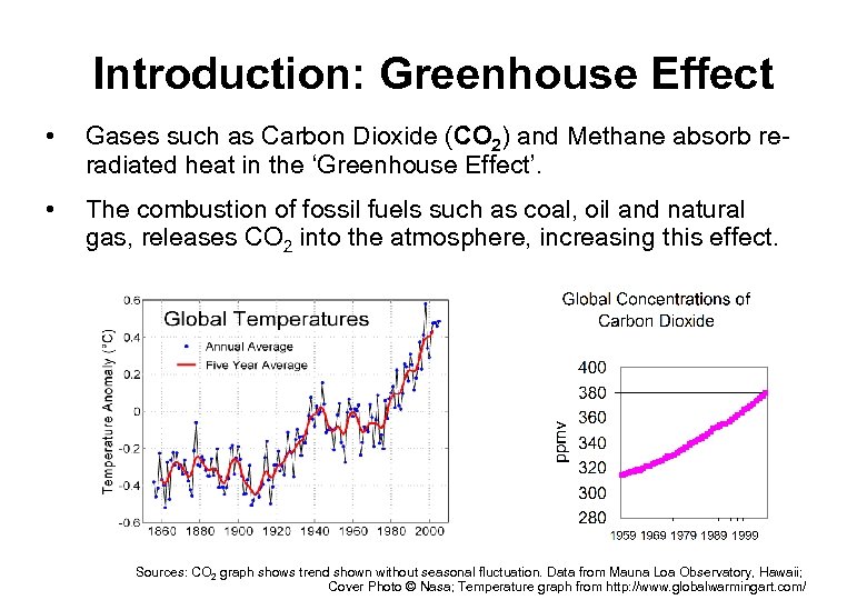 Introduction: Greenhouse Effect • Gases such as Carbon Dioxide (CO 2) and Methane absorb reradiated heat in the ‘Greenhouse Effect’. • The combustion of fossil fuels such as coal, oil and natural gas, releases CO 2 into the atmosphere, increasing this effect. Sources: CO 2 graph shows trend shown without seasonal fluctuation. Data from Mauna Loa Observatory, Hawaii; Cover Photo © Nasa; Temperature graph from http: //www. globalwarmingart. com/
