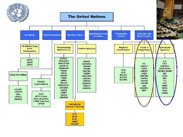 Overview § The United Nations is made up of a variety of organizational entities: § Funds & Programmes § Specialised Agencies, § Secretariat: UNHQs, Offices Away From Headquarters, commissions, tribunals and field peacekeeping missions. § Each organization has a distinct and separate mandate covering the political, economic, social, scientific, humanitarian, and technical fields.