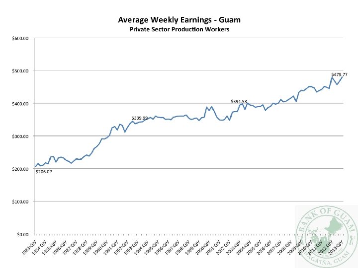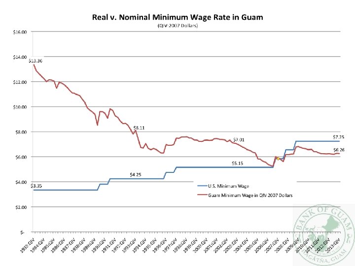 The Minimum Wage • A hot topic, especially since President Obama brought it up in the 2013 State of the Union – Little chance it will pass Congress, though, making it a big campaign issue this year • Wage rates don’t matter; it is what you can buy with those wages that is important • The minimum wage in Guam, adjusted for inflation, has not fared very well over the years – It’s has less than half the purchasing power that it had 30 years ago – A $10. 10 minimum wage would get us back to where we were in the middle of 1992