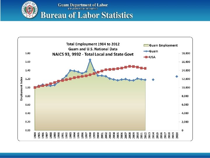 1. 40 Total Employment 1984 to 2012 Guam and U. S. National Data NAICS 91 - Total Federal Govt Employment Guam 9, 000 8, 000 1. 20 1. 00 6, 000 0. 80 5, 000 0. 60 4, 000 3, 000 0. 40 2, 000 0. 20 1, 000 0 0. 00 1984 1985 1986 1987 1988 1989 1990 1991 1992 1993 1994 1995 1996 1997 1998 1999 2000 2001 2002 2003 2004 2005 2006 2007 2008 2009 2010 2011 2012 2013 2014 2015 2016 2017 2018 2019 2020 Employment Index 7, 000