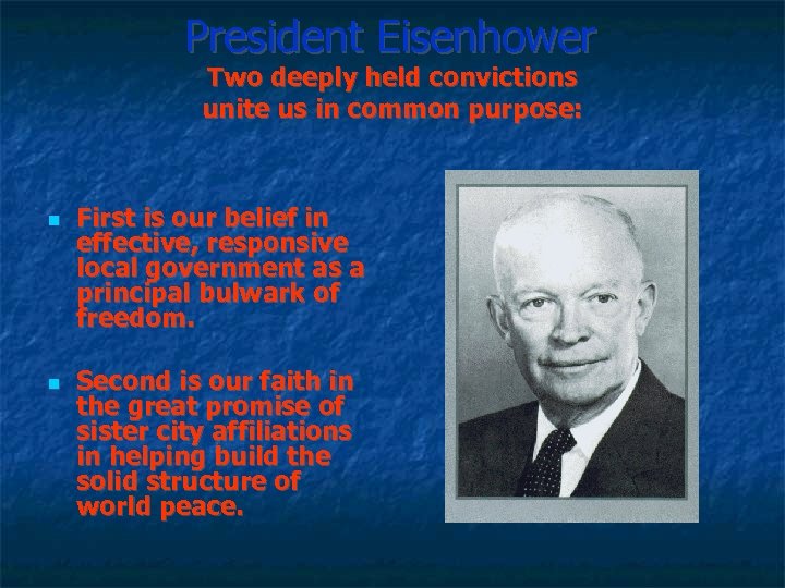 President Eisenhower Two deeply held convictions unite us in common purpose: First is our belief in effective, responsive local government as a principal bulwark of freedom. Second is our faith in the great promise of sister city affiliations in helping build the solid structure of world peace.