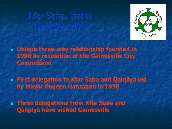 Kfar Saba, Israel Qalqilya, PNA Unique three-way relationship founded in 1998 by resolution of the Gainesville City Commission First delegation to Kfar Saba and Qalqilya led by Mayor Pegeen Hanrahan in 1998 Three delegations from Kfar Saba and Qalqilya have visited Gainesville