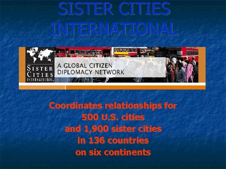 SISTER CITIES INTERNATIONAL Coordinates relationships for 500 U. S. cities and 1, 900 sister cities in 136 countries on six continents