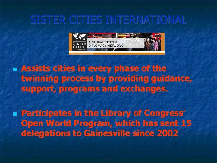 SISTER CITIES INTERNATIONAL Assists cities in every phase of the twinning process by providing guidance, support, programs and exchanges. Participates in the Library of Congress’ Open World Program, which has sent 15 delegations to Gainesville since 2002