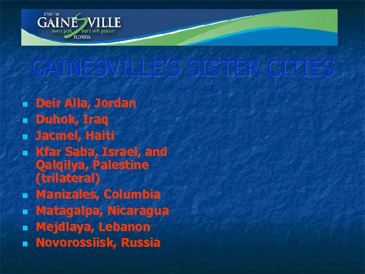 GAINESVILLE’S SISTER CITIES Deir Alla, Jordan Duhok, Iraq Jacmel, Haiti Kfar Saba, Israel, and Qalqilya, Palestine (trilateral) Manizales, Columbia Matagalpa, Nicaragua Mejdlaya, Lebanon Novorossiisk, Russia