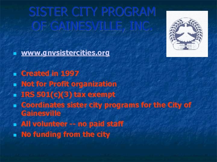 SISTER CITY PROGRAM OF GAINESVILLE, INC. www. gnvsistercities. org Created in 1997 Not for Profit organization IRS 501(c)(3) tax exempt Coordinates sister city programs for the City of Gainesville All volunteer -- no paid staff No funding from the city