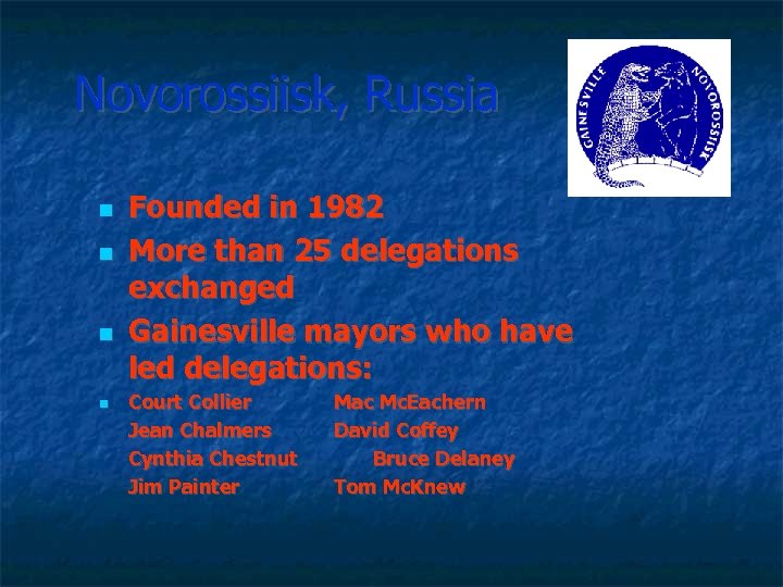 Novorossiisk, Russia Founded in 1982 More than 25 delegations exchanged Gainesville mayors who have led delegations: Court Collier Jean Chalmers Cynthia Chestnut Jim Painter Mac Mc. Eachern David Coffey Bruce Delaney Tom Mc. Knew