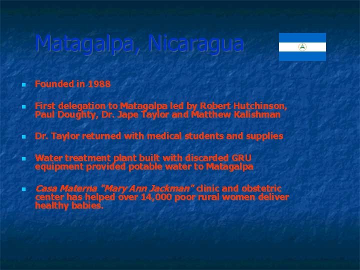 Matagalpa, Nicaragua Founded in 1988 First delegation to Matagalpa led by Robert Hutchinson, Paul Doughty, Dr. Jape Taylor and Matthew Kalishman Dr. Taylor returned with medical students and supplies Water treatment plant built with discarded GRU equipment provided potable water to Matagalpa Casa Materna "Mary Ann Jackman" clinic and obstetric center has helped over 14, 000 poor rural women deliver healthy babies.