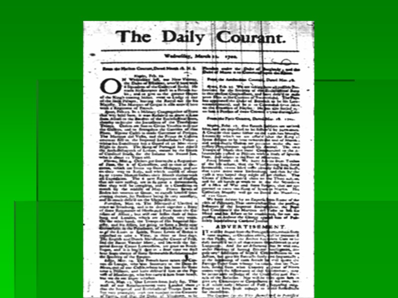 A Bit of History Newspapers appeared in many European countries in the 17th century. The first English printed news book averaging twenty-two pages was the "Weekly News". It appeared in Lon don in 1621. By the 1640s the news book had taken the form of a newspaper. The first periodical was the "London Gazette", a bi weekly court paper. It started as the "Oxford Gazette" in 1665 when the King and the court moved to Oxford because of London plague.