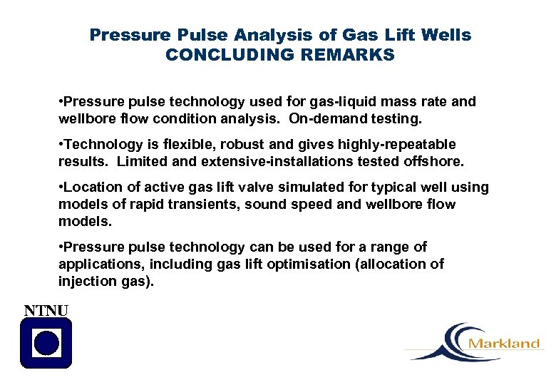 Pressure Pulse Analysis of Gas Lift Wells CONCLUDING REMARKS • Pressure pulse technology used for gas-liquid mass rate and wellbore flow condition analysis. On-demand testing. • Technology is flexible, robust and gives highly-repeatable results. Limited and extensive-installations tested offshore. • Location of active gas lift valve simulated for typical well using models of rapid transients, sound speed and wellbore flow models. • Pressure pulse technology can be used for a range of applications, including gas lift optimisation (allocation of injection gas). NTNU