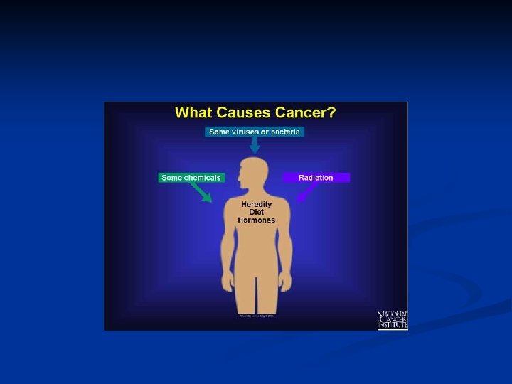 WHAT IS CANCER? n n Cancer is not a single disease but a group of over 100 different diseases chracterized by abnormal cell growth and replication. Normally, cell sgrow and are replaced in an orderly manner. Enough new cells grow to replace the ones that are worn out and iniured. Cancer cells lack controls to stop the growth process and continue to grow and multiply without restraint. This loss of control of cell growth may be due to a variety of factors. Ultraviolet radiation from sunlight, tobacco smoke, viral infections, diet, and chemicals in food and the environment all have been implicated.
