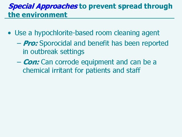 Special Approaches to prevent spread through the environment • Use a hypochlorite-based room cleaning agent – Pro: Sporocidal and benefit has been reported in outbreak settings – Con: Can corrode equipment and can be a chemical irritant for patients and staff