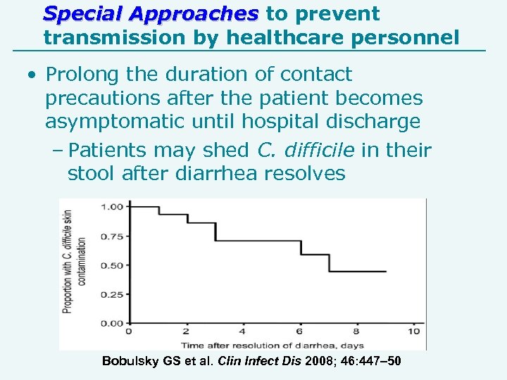 Special Approaches to prevent transmission by healthcare personnel • Prolong the duration of contact precautions after the patient becomes asymptomatic until hospital discharge – Patients may shed C. difficile in their stool after diarrhea resolves Bobulsky GS et al. Clin Infect Dis 2008; 46: 447– 50