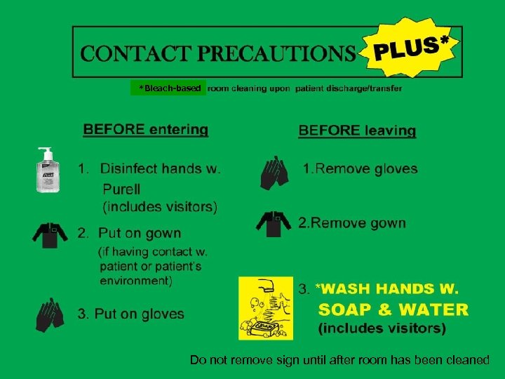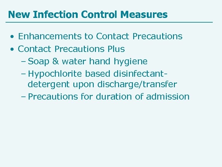 New Infection Control Measures • Enhancements to Contact Precautions • Contact Precautions Plus – Soap & water hand hygiene – Hypochlorite based disinfectantdetergent upon discharge/transfer – Precautions for duration of admission