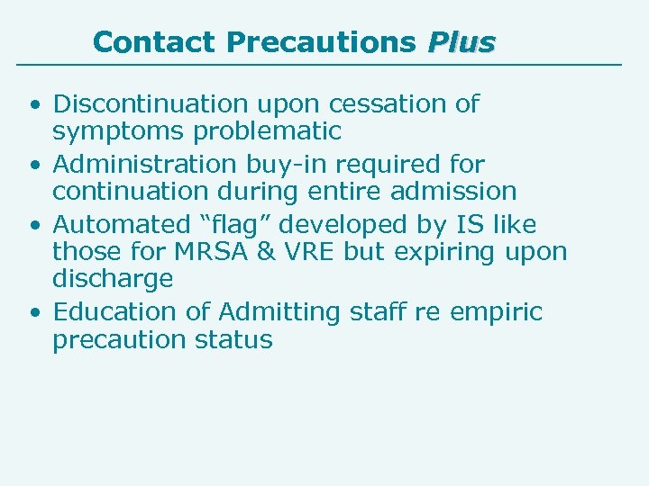 Contact Precautions Plus • Discontinuation upon cessation of symptoms problematic • Administration buy-in required for continuation during entire admission • Automated “flag” developed by IS like those for MRSA & VRE but expiring upon discharge • Education of Admitting staff re empiric precaution status