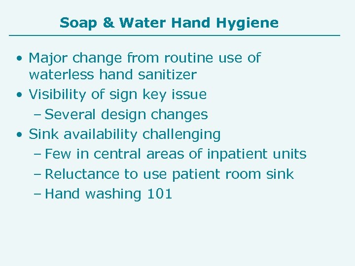 Soap & Water Hand Hygiene • Major change from routine use of waterless hand sanitizer • Visibility of sign key issue – Several design changes • Sink availability challenging – Few in central areas of inpatient units – Reluctance to use patient room sink – Hand washing 101