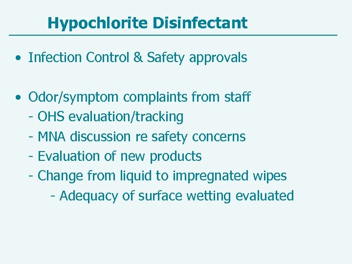 Hypochlorite Disinfectant • Infection Control & Safety approvals • Odor/symptom complaints from staff - OHS evaluation/tracking - MNA discussion re safety concerns - Evaluation of new products - Change from liquid to impregnated wipes - Adequacy of surface wetting evaluated