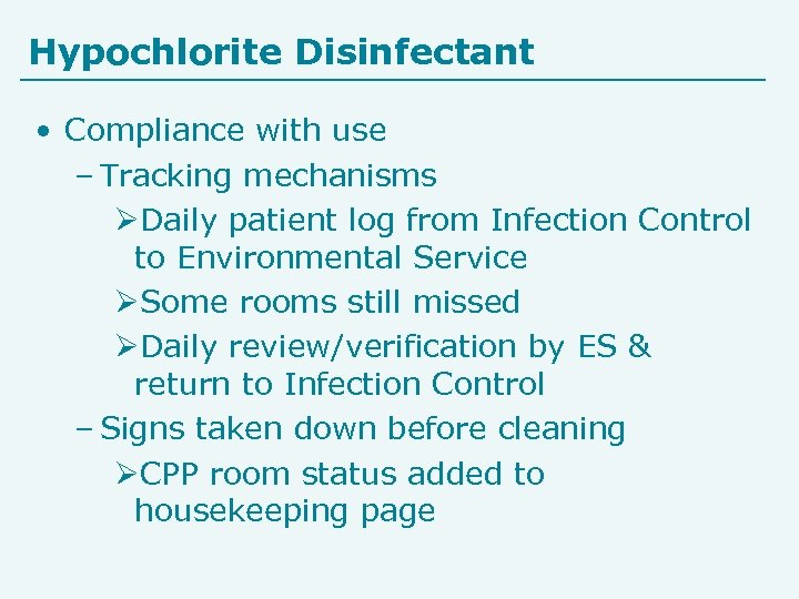 Hypochlorite Disinfectant • Compliance with use – Tracking mechanisms ØDaily patient log from Infection Control to Environmental Service ØSome rooms still missed ØDaily review/verification by ES & return to Infection Control – Signs taken down before cleaning ØCPP room status added to housekeeping page