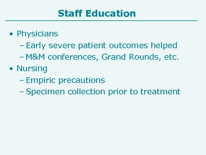Staff Education • Physicians – Early severe patient outcomes helped – M&M conferences, Grand Rounds, etc. • Nursing – Empiric precautions – Specimen collection prior to treatment