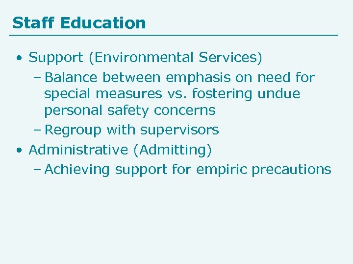 Staff Education • Support (Environmental Services) – Balance between emphasis on need for special measures vs. fostering undue personal safety concerns – Regroup with supervisors • Administrative (Admitting) – Achieving support for empiric precautions