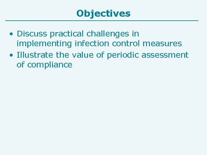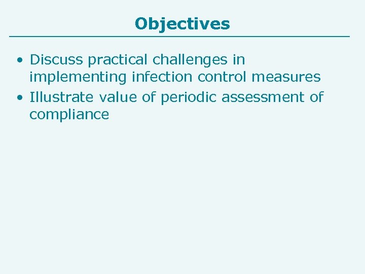 Objectives • Discuss practical challenges in implementing infection control measures • Illustrate the value of periodic assessment of compliance