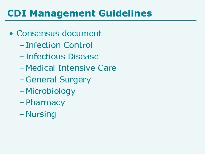 CDI Management Guidelines • Consensus document – Infection Control – Infectious Disease – Medical Intensive Care – General Surgery – Microbiology – Pharmacy – Nursing
