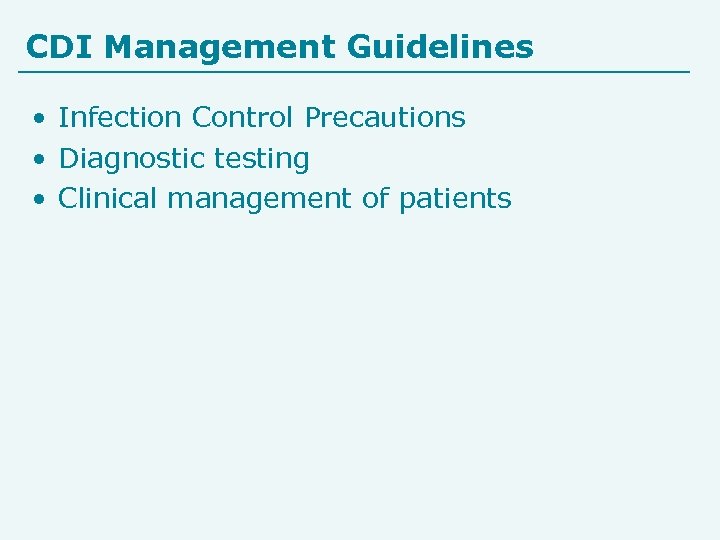 CDI Management Guidelines • Infection Control Precautions • Diagnostic testing • Clinical management of patients